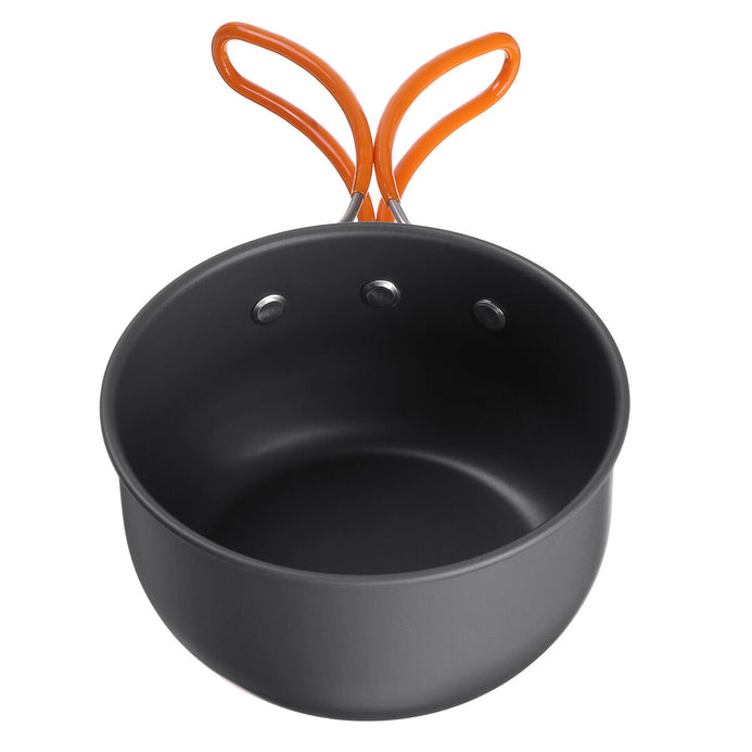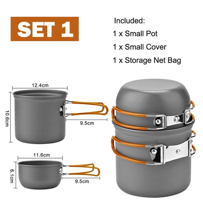 Specifications:Material Aluminum alloySmall pot size Diameter 12.4cm/4.88'', Height 10.6cm/4.17''Small cover size 11.6cm/4.56'', height 6.1cm/2.4''Suitable For 1-2 personsPackage Included:1 x Small Pot1 x Small Cover1 x Storage Net Bag【SET 2】Specification:Material Advanced Hard Aluminum AluminaColor OrangeTeapot Size 138*138*80mm/5.4*5.4*3.1inCooked Size 170*170*90mm/6.7*6.7*3.5inFrying Pan Size 180*180*45mm/7.1*7.1*1.8inPackage Included:1 x Teapot1 x Cooking Pot1 x Frying Pan【SET 3】Specifications:Small cup pot size 122x105mm/4.80*4.13" (bottom diameter*height)Small cup bowl size 115x60mm/4.53*2.36" (bottom diameter*height)Stainless steel spoon size 160*40mm/6.30*1.57"Stainless steel table knife size 165*12mm/6.50*0.47"Stainless steel fork size 160*12mm/6.30*0.47"Stove size 40x55x80mm/1.57*2.17*3.15"Small bowl Diameter 110mm/4.33", high 40mm/1.57"Bamboo shovel 1 piece, 130*50mm/5.12*1.20"Plastic spoon 1 piece, 160mm/6.30" in length, 78mm/3.07" in caliber, 20mm/0.79" in depthClean ball 1 pieceLock 1 piece, 70*81mm/2.76*3.19"MaterialThe set of pots is made of hard aluminum alumina, aluminum thickness: 0.7mm/0.03".Fork spoon is made of 410 stainless steel, handle is made of 201 stainless steel.Stove is made of high-strength aluminum alloy.Package Included:1 x Small cup bowl1 x Small cup pot1 x Stainless steel spoon1 x Stainless steel table knife 1 x Stainless steel fork 1 x Stove1 x Small bowl1 x Bamboo shovel1 x Plastic spoon1 x Clean ball1 x Lock【SET 4】Specifications:Material Advanced hard aluminaCooker size 166x89mm/6.54*3.50"Fry pan size 167x39mm/6.57*1.54"Kettle volume 800ml (140mm/5.51" in diameter, 80mm/3.15" in height, 90mm/3.54" in diameter of lid, 18mm/0.71" in diameter of outlet)Basin volume 6L (size 295*135mm/11.61*5.31")Suitable number 2-3 peopleType Orange HandlePackage Included:1 X Cooking Pan1 X Dry Pan1 X Kettle3 X Bowls1 X Soup Spoon1 X Dishcloth1 X Bamboo Spoon2 X Foldable Forks【SET 5】Specifications:Product material Advanced hard aluminaCooking pot 1 piece, outer diameter 175mm/6.89", height 90mm/3.54"Fry pan 1 piece, diameter 180mm/7.09", height 45mm/1.77", handle 100mm/3.94"Kettle 1 piece, 0.8L, diameter 1380mm/54.33", height 80mm/3.15"Spoon size 160*40mm/6.30*1.57"Table knife size 165*12mm/6.50*0.47"Fork size 160*12mm/6.30*0.47"Lock 70*81mm/2.76*3.19"304 stainless steel water cup 2 piece, 70*78mm/2.76*3.07", 200mlStove 1 piece, 110*78mm/4.33*3.07"Color OrangePackage Included:1 X Cooking Pan1 X Fry Pan1 X Kettle2 X Water Cups1 X Fork1 X Spoon1 X Table Knife1 X Lock1 X Cutting Board